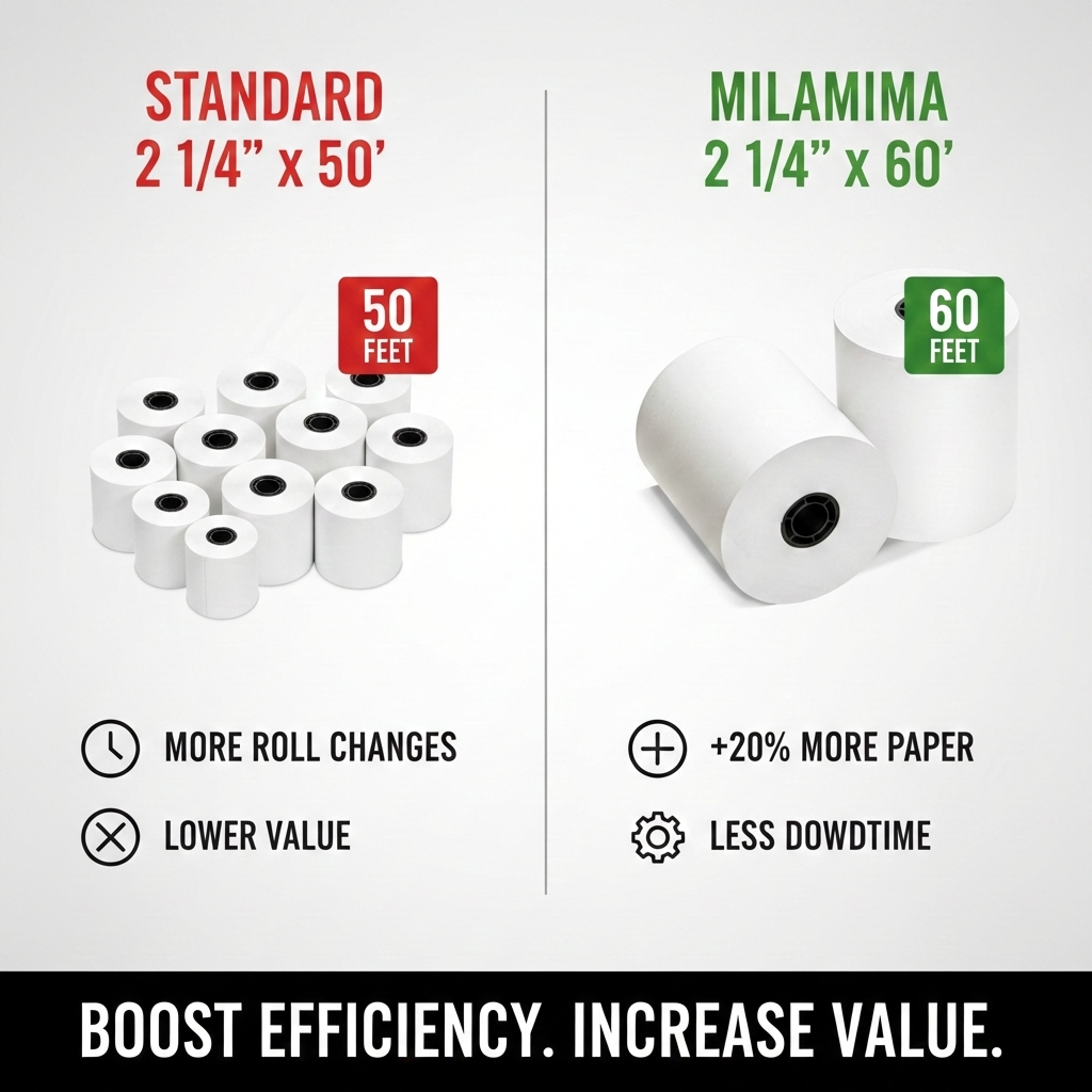 Upgrade to 60ft rolls—20% more paper than standard 50ft rolls. BPA-free, jam-resistant, and compatible with Verifone, Ingenico & Square terminals. Perfect for high-volume Canadian retail & cafes.